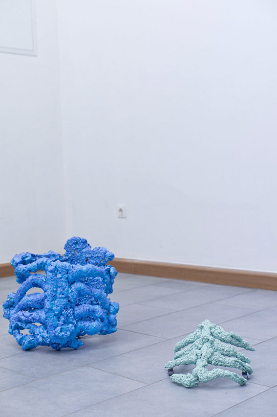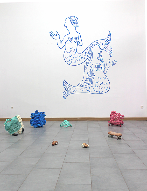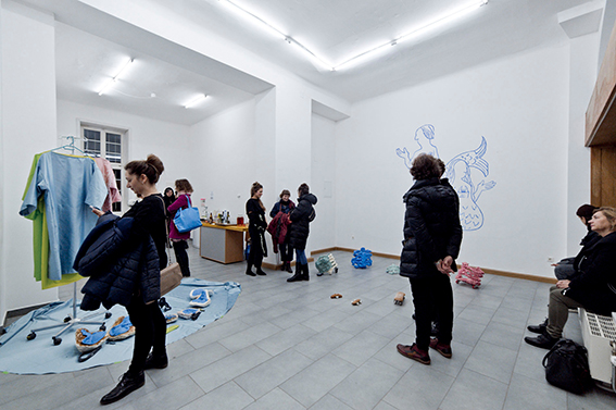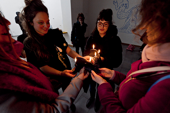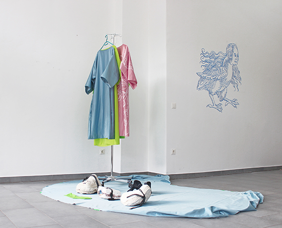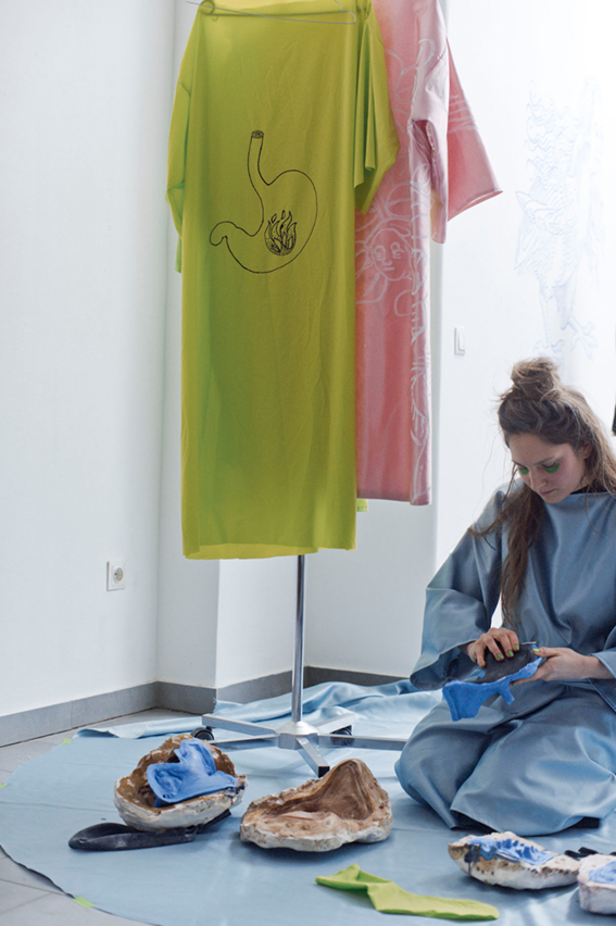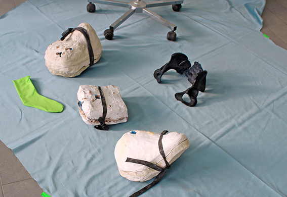 Performance with casts of plaster, silicone and hip bone candles. Costumes: self-sewn hospital gowns. Objects and wall paintings: bread, wheels, foam, acrylic 2019